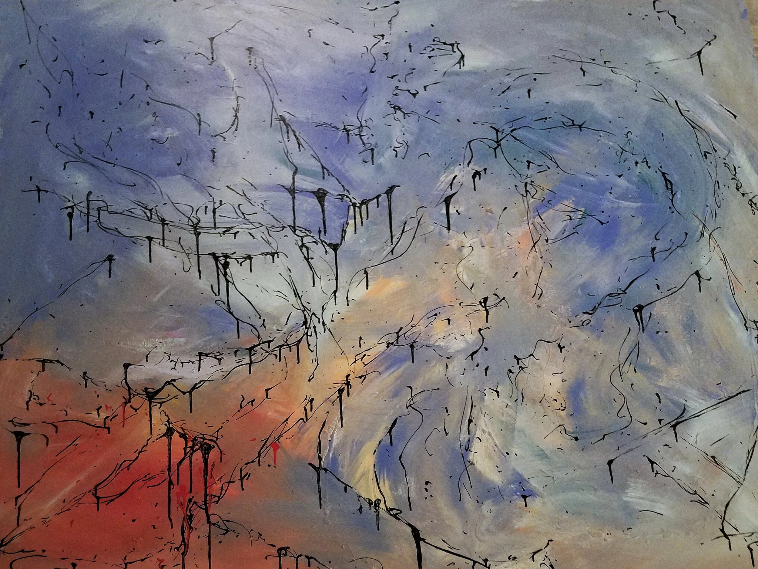 It was important to me that the fill in the rigid areas not completely stop the motion of the piece, and I am happy with how the swirling brushstrokes allow that freedom to carry through, even within the grid.